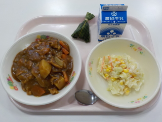 カレーライス、コールスロー、牛乳、ミニ笹団子 |