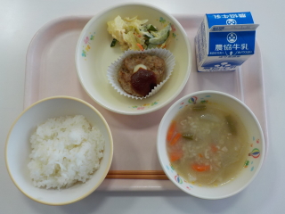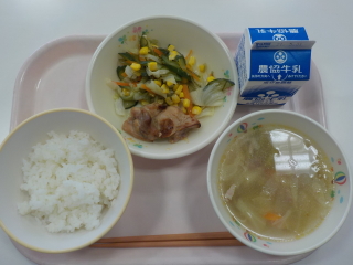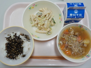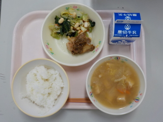 ごはん、照り焼きチキン、昆布サラダ、春キャベツのスープ、牛乳 |