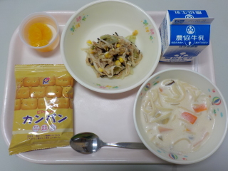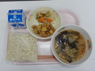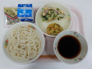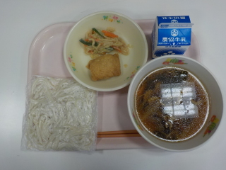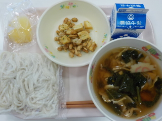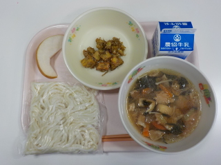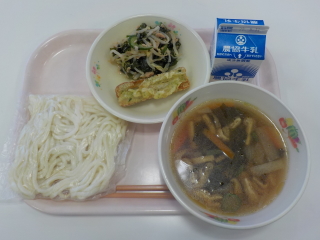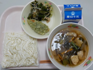 山菜うどん、笹かまぼこのいそべ揚げ、わかめとツナの和え物、牛乳 |
