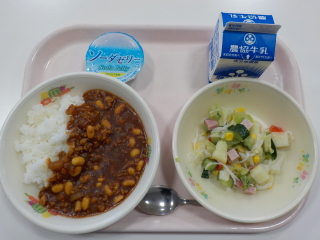 チリコンカンライス、パプリカサラダ、牛乳、ソーダゼリー |