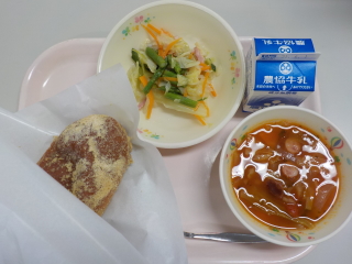 きなこ揚げパン(米粉パン)、アスパラサラダ、ビーンズスープ、牛乳 |