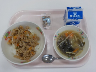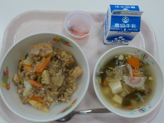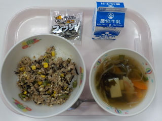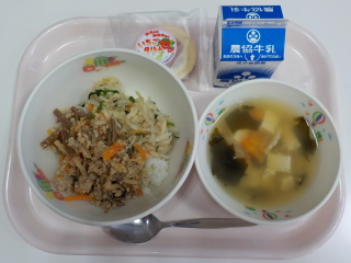 ひじきそぼろ丼、ワンタンスープ、牛乳、ミニフィッシュ |