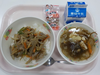 かみかみ丼、もずくスープ、牛乳、かみかみ大豆 |