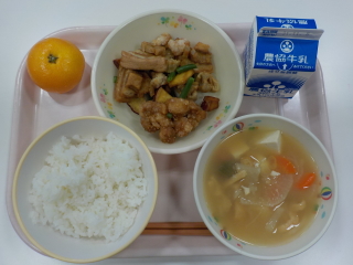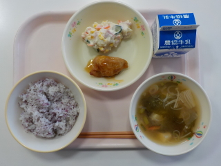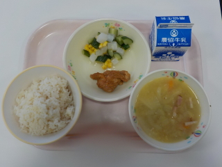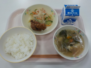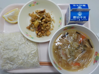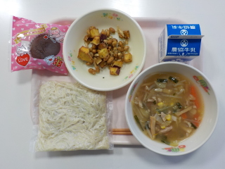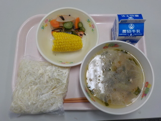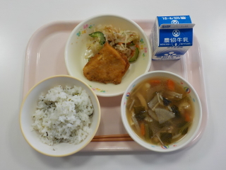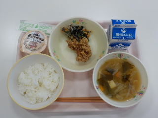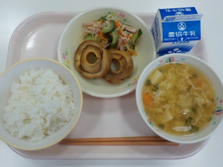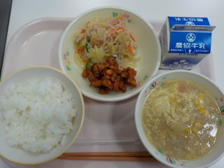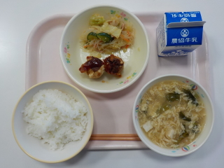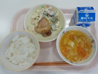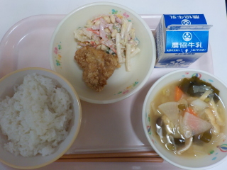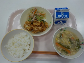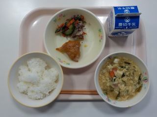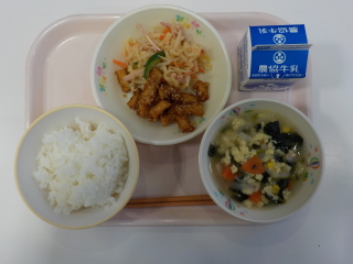 ごはん、鶏の米々揚げ、春雨サラダ、中華豆腐スープ、牛乳 |