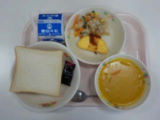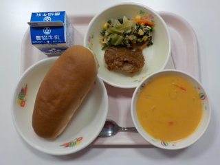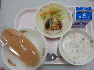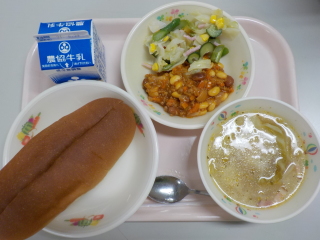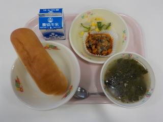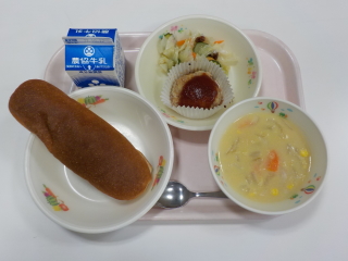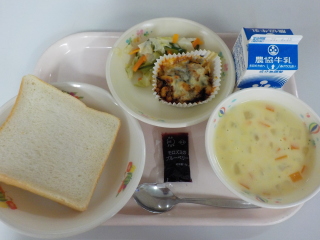 食パン、ブルーベリージャム、大豆とひじきのチーズ焼き、フレンチサラダ、コーンポタージュ、牛乳 |