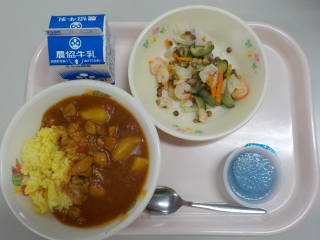 コロンボカレー、シュリンプビーンズサラダ、牛乳、カリブ海ゼリー |