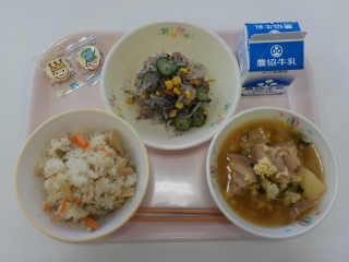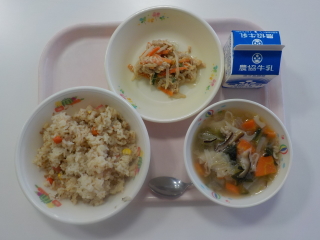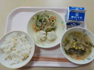 中華風たけのこごはん、しゅうまい、ゆかり和え、どさんこ汁、牛乳 |
