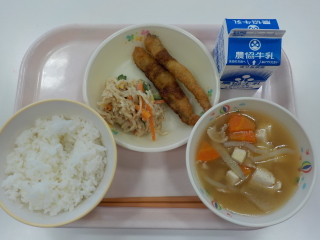 ごはん、ししゃもフライ、バンバンジーサラダ、豚汁、牛乳 |