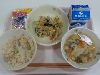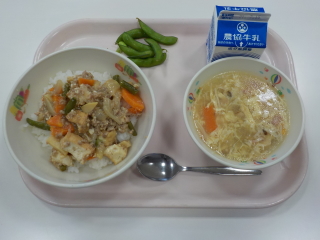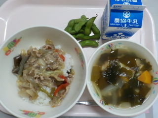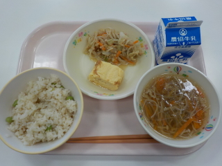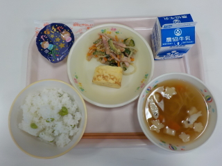 大豆ごはん、枝豆しゅうまい、ごま酢あえ、どさんこ汁、牛乳 |