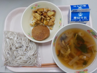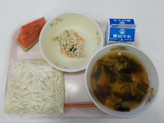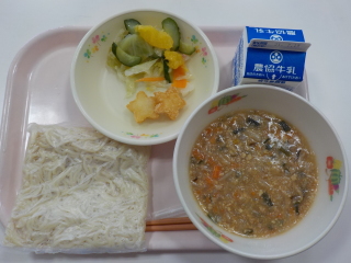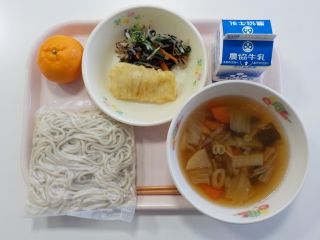 大麦めん、和風汁、いかの天ぷら、磯香和え、ぽんかん、牛乳