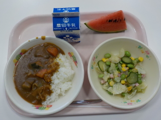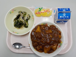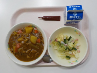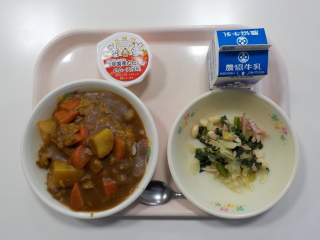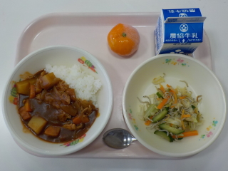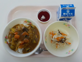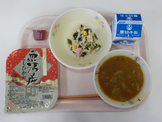 カレーライス、のり酢あえ、牛乳、お祝いゼリー |