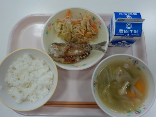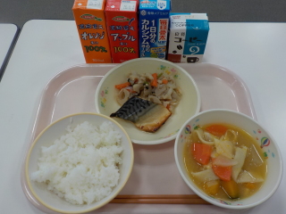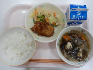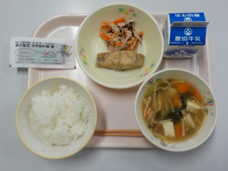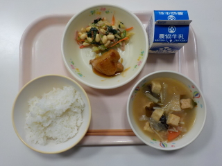 ごはん、さわらの照り焼き、五目きんぴら、健康豆汁、牛乳