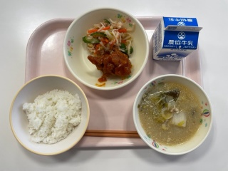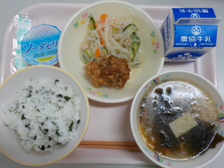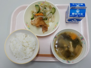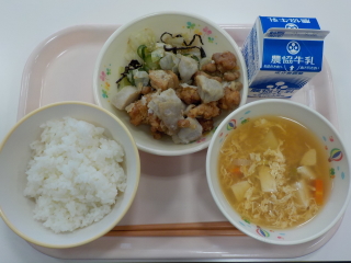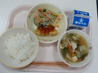 ごはん、鶏の唐揚げねぎソース、春雨サラダ、わかめスープ、牛乳