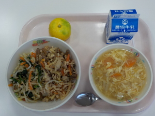ビビンバ、わかめスープ、牛乳、いちごのタルト |