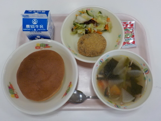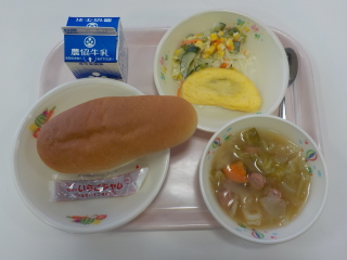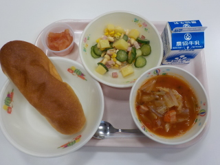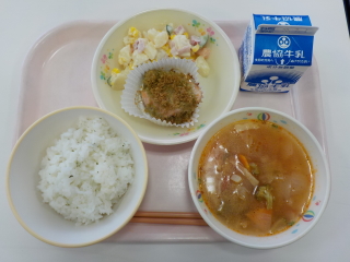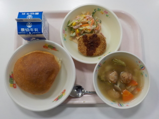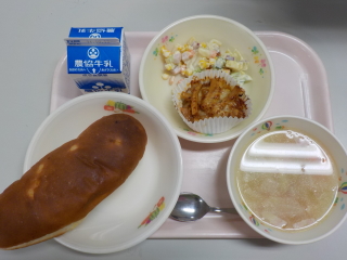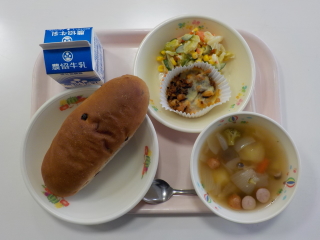 チョコチップパン、大豆とひじきのチーズ焼き、コーンドレッシングサラダ、ポトフ、牛乳