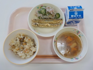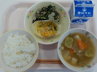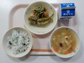 わかめごはん、ししゃもの磯辺揚げ、ごま和え、さつま汁、牛乳
