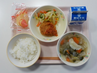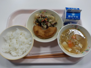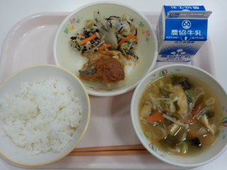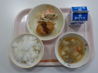 ごはん、牛肉コロッケ、じゃこサラダ、石狩汁、牛乳