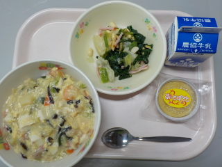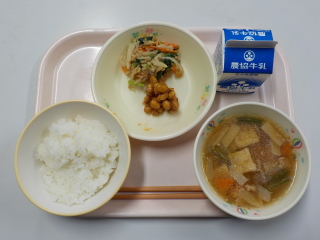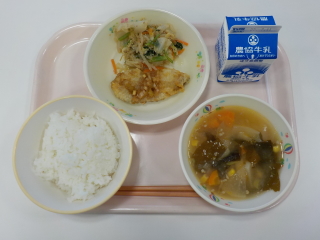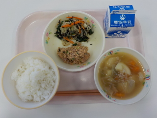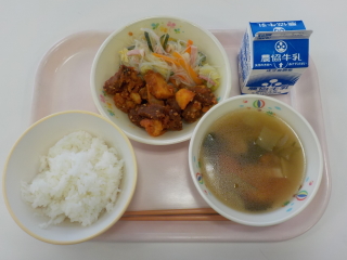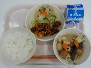 ごはん、車麩の揚げ煮、雪さらし和え、気球スープ、牛乳