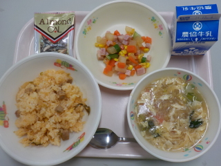 ごはん、いかのアーモンドがらめ、しょうゆフレンチ、たまごとコーンの中華スープ、牛乳 |