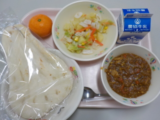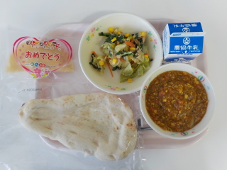 ナン、キーマカレー、ポパイサラダ、お祝いクレープ、牛乳