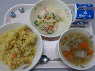 チャーハン、にんじゃサラダ、もずくスープ、牛乳、かみかみ大豆 |