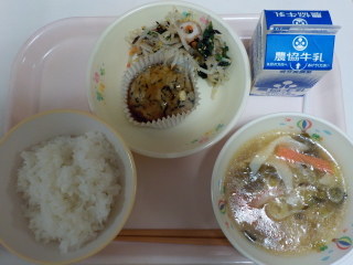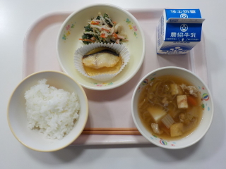 ごはん、銀だらみそ焼き、ごま酢あえ、芋煮なべ、牛乳