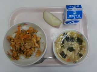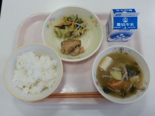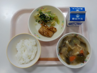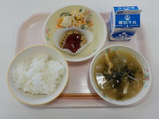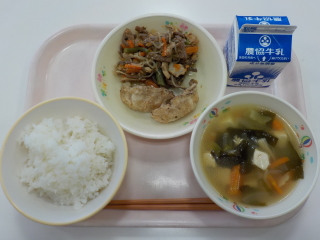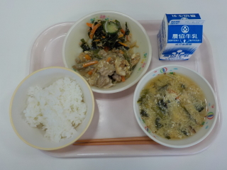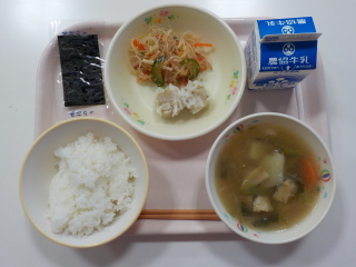 ごはん、とりのさっぱり煮、こんぶサラダ、たまねぎのみそ汁、牛乳 |