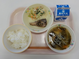 ごはん、ほっけの塩ゴマ焼き、のり酢あえ、大根と油揚げのみそ汁、牛乳