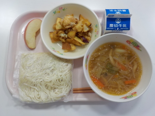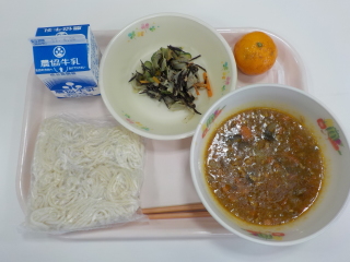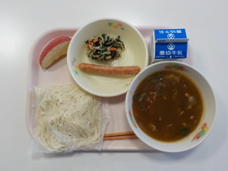 ソフト麺、カレー汁、ソーセージ、のり酢あえ、りんご、牛乳