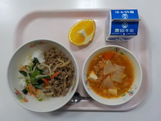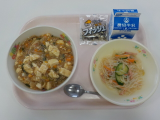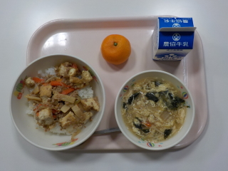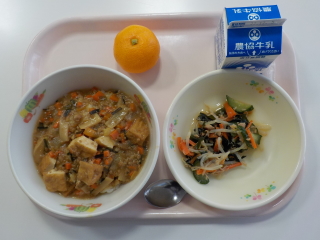 マーボー丼、切り干し大根のさっぱりあえ、牛乳、きよみオレンジ |