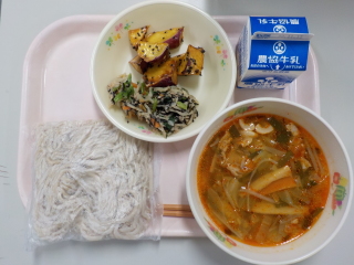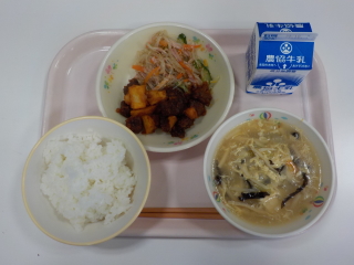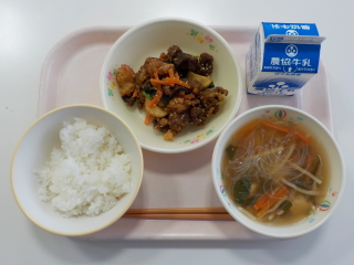 ごはん、レバーとポテトのケチャップあえ、春雨サラダ、中華豆腐スープ、牛乳 |