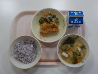 ごはん、鶏のゆず照り焼き、小松菜と大豆のサラダ、生揚げのみそ汁、牛乳