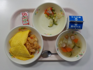 セルフオムライス、個袋トマトケチャップ、白菜フレンチサラダ、ウインナーとかぶのスープ、牛乳