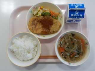 ごはん、みそカツ、キャベツサラダ、さわに椀、牛乳