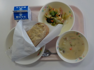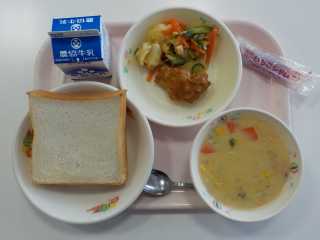 食パン、いちごジャム、タンドリーチキン、かぶのサラダ、豆乳コーンチャウダー、牛乳