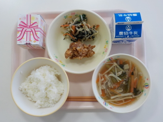 ごはん、鶏の唐揚げ、のり酢あえ、沢煮椀、お祝いケーキ、牛乳
