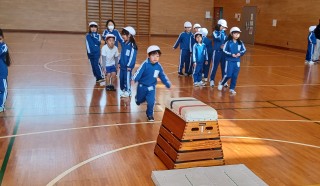 1年生は、跳び箱を使った運動あそびを行っています。大きな跳び箱にまたがったり、ジャンプして降りたりと、体を大きく使って楽しみながら学習をしています。ジャンプしながら空中で手を叩くなど、自分で動きを工夫しながら運動に親しむ姿が見られました。これからの体育でも、考え楽しむことを大切にしてほしいと思います。