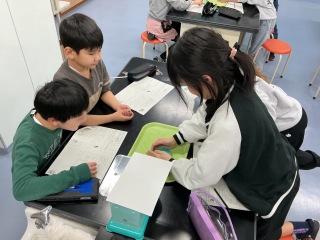クローバ学年2年生は算数で「箱の形」を学習しています。身のまわりにある箱の面を紙に写し、切り取りどのような特徴があるのか調べたり、どんな条件で箱の形になるのか組み合わせたりしました。そして切り取った面を組み立てて箱を作ることができました。子どもたちは「違う大きさの箱も作りたい!」と意欲をもって取り組んでいました。